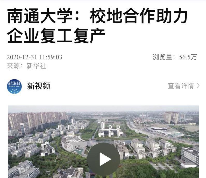 12月31日,新华社以《南通大学:校地合作助力企业复工复产》为题,报道我校助力企业复工复产行动。据报道,随着疫情防控进入常态化阶段,我校启动“百名专家服务百企、科技助力复工复产”专项行动,组织专家教授,科...
