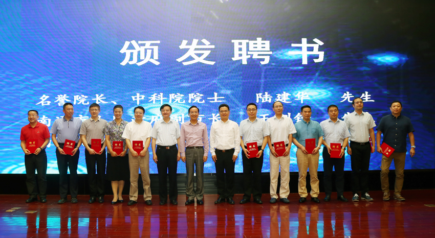 陆建华、王剑锋、程纯共同为专家们颁发南通先进通信技术研究院事业发展咨询委员会委员聘书。