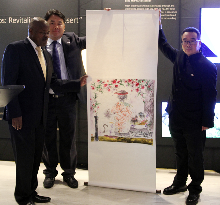艺术学院张卫(右)出席联合国“拯救地球”绿色团展览会并捐赠画作。
