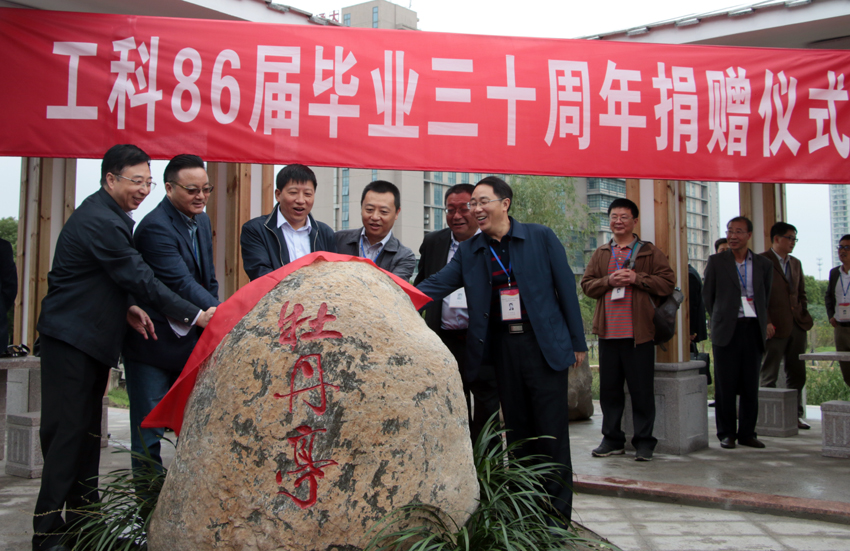 南京市秦淮区检察院政治部主任贡小康、蓝舰信息科技公司投资人刘春娥、南通楼台卧室用品有限公司总经理茌惠卿、华润集团EHS部运营总监虞柏林、宜兴市建设资产经营公司办公室主任孙春燕作为校友代表分别发言,回忆在母校求学时的难忘时光,向母校汇报了三十年的工作成绩,表达了对母校、老师、同学的深切思念。校友们对母校的巨变感到由衷欣慰,纷纷表示要继续努力,为母校的进一步发展壮大做出自己的贡献,衷心祝愿母校的明天更加美好,并向母校捐赠了10万元,用于在主校区建设牡丹亭,表达校友对母校辛勤培育的感激之情。副校长樊小东代表学校与校友们一同为牡丹亭揭牌。
