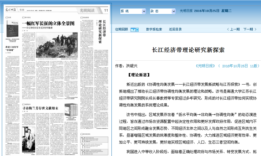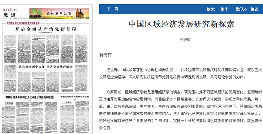 同时,10月25日出版的光明日报11版刊登南京大学原党委书记洪银兴对该著作的书评《长江经济带理论研究新探索》,11月1日出版的新华日报思想版刊登湖北省社会科学院研究员彭智敏对该著作的书评《中国区域经济发展研究新探索》,高度评价了该书的理论价值、政策主张和现实意义。