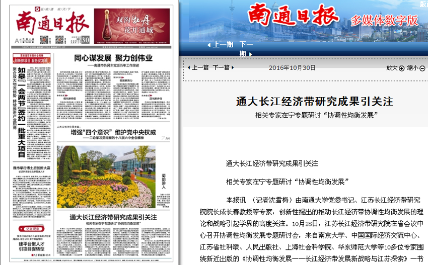 10月28日,江苏长江经济带研究院学术委员会第二次会议暨协调性均衡发展专题研讨会在江苏省会议中心召开。会上,与会专家围绕由我校江苏长江经济带研究院专家成长春、杨凤华等撰写的著作《协调性均衡发展——长江经济带发展新战略与江苏探索》一书发布展开交流和研讨。书中创新性提出的推动长江经济带协调性均衡发展的理论和战略引起学界和媒体的广泛关注和热议。新华社、人民网、中国社会科学网、中国科技网、交汇点、江苏卫视等各大媒体纷纷予以报道。