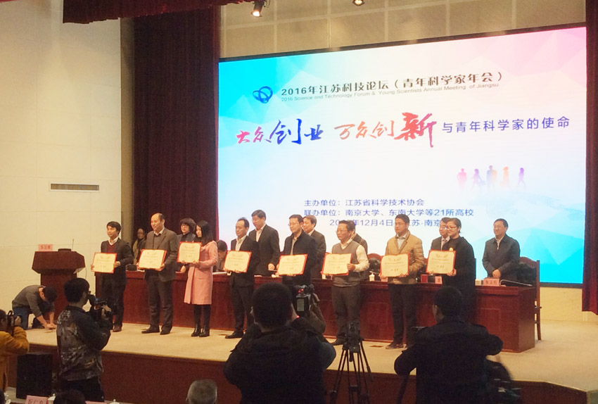 12月4日,2016年江苏省科技论坛(青年科学家年会)在江苏省科技工作者活动中心举行。开幕式上颁发了首届江苏省科协青年会员创新创业大赛奖项。由我校科协推荐,化学化工学院朱鹏副教授主持的《高效晶体硅太阳能电极材料》项目喜获二等奖。
