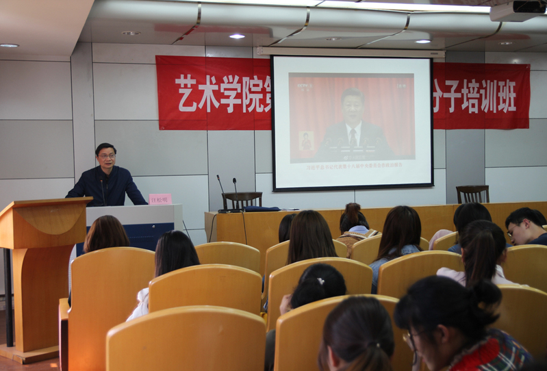 为加强入党积极分子培训班学员对党的十九大精神的全面理解,明确新时代大学生党员的时代责任和担当。4月18日下午,艺术学院党总支书记汪松明为培训班学员做十九大精神辅导报告。艺术学院全体辅导员、第十七期入党积极分子培训班108名学员听取了报告。