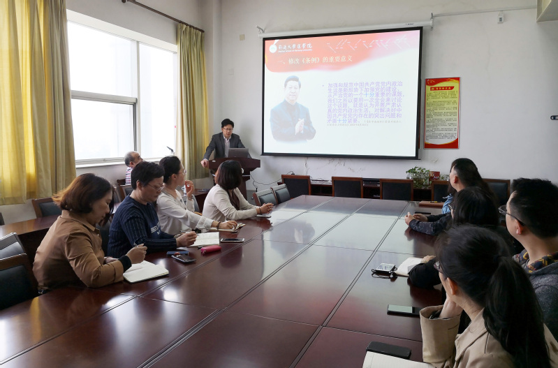 宋建阐述了《中国共产党党内监督条例》修订的重要意义,深入解读了《条例》的框架结构和主要内容,指出修订后的《条例》是实现依规管党治党、加强党内监督的重大举措和重要抓手,要进一步强化学习,把精神领会透,提高贯彻落实的自觉性。他结合学院实际,从基层党组织、领导干部和广大党员三个层面上就如何贯彻落实好《条例》提出具体要求,基层党组织要切实履行全面从严治党主体责任,加强组织领导,坚持把制度挺在前面,发挥好“三会一课”、组织生活会等党内制度作用,强化日常监督,抓早抓小,防微杜渐;领导干部要严守廉洁自律底线,勇于担当,以身作则,带出好风气;广大党员要坚守政治信仰,牢记职责使命,不忘初心,永葆党员清正廉洁本色。