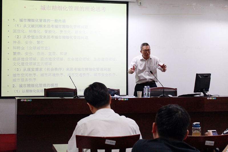 唐亚林教授做了题为《城市精细化管理的内涵和顶层设计》的学术报告。他从城市发展以“卖土地”“造新城”“盖楼房”为重点的规模化建设进入以“补短板”为重点的城市精细化管理“短板”现象入手,结合上海城市发展与治理的主题聚焦问题,提出了城市精细化管理社会治理范式的转型。唐亚林教授详细介绍了上海城市精细化管理的 “五大秩序的建构”、“三大实践探索”做法和专业管理领域的三大体制改革、综合管理领域的三大平台创新、综合服务信息管理平台创新的三大治理能力提升的上海城市精细化管理经验,并对新社会治理范式成长中城市社会新型政社关系建构进行了展望。