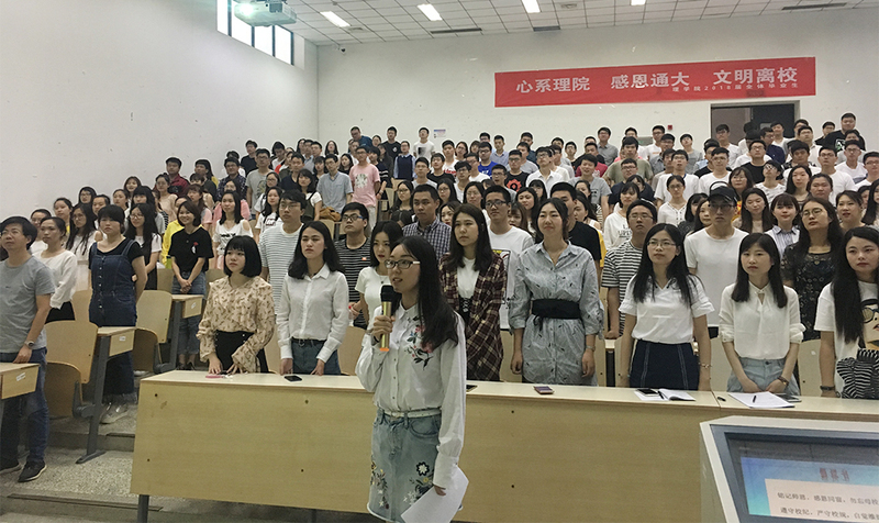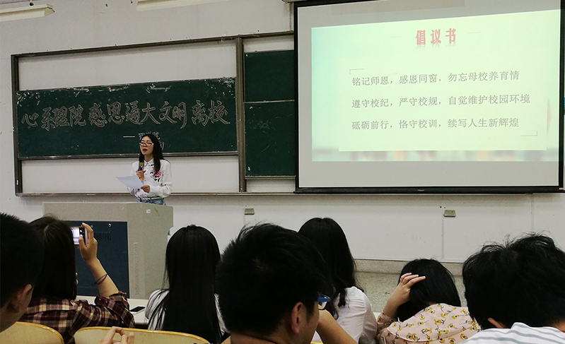 统计141班胡丹青代表2018届全体党员宣读了“心系理院,感恩通大,文明离校”倡议书,号召全体毕业生在即将离开母校之际,铭记师恩,感恩同窗,勿忘母校养育情;遵守校纪,严守校规,自觉维护校园环境;砥砺前行,恪守校训,续写人生新辉煌。光电141班赵辉代表班级团支部宣读了2018届毕业生“感恩母校,爱心离校”倡议书,号召全体毕业生为母校留下自己的印痕,献出自己的热诚,为母校106岁华诞留下一份美好的回忆。
