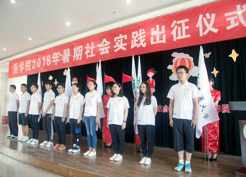 6月23日,医学院举行2018年暑期社会实践出征仪式。学院28支社会实践小分队全体成员及指导老师参加活动。