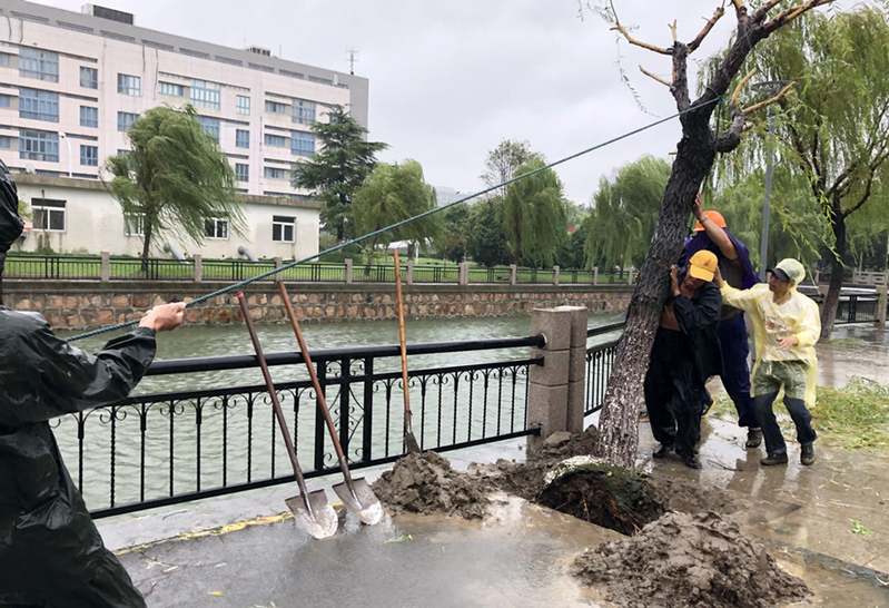 8月17日早上7点,后勤保障部副主任徐建带领环境服务中心班子成员第一时间赶赴现场,奋战一线,察看校园各处情况。三校区二十余株树木被刮断或刮倒,部分树木甚至连根拔起,横倒在道路中央,一时间造成校内外道路阻塞。他们冒着风雨抓紧时间,及时组织人员疏通堵塞的道路、清理横卧在道路上折断的树木、砍伐影响交通的树枝和树杈,并检查三校区水泵运行情况,防止积水。