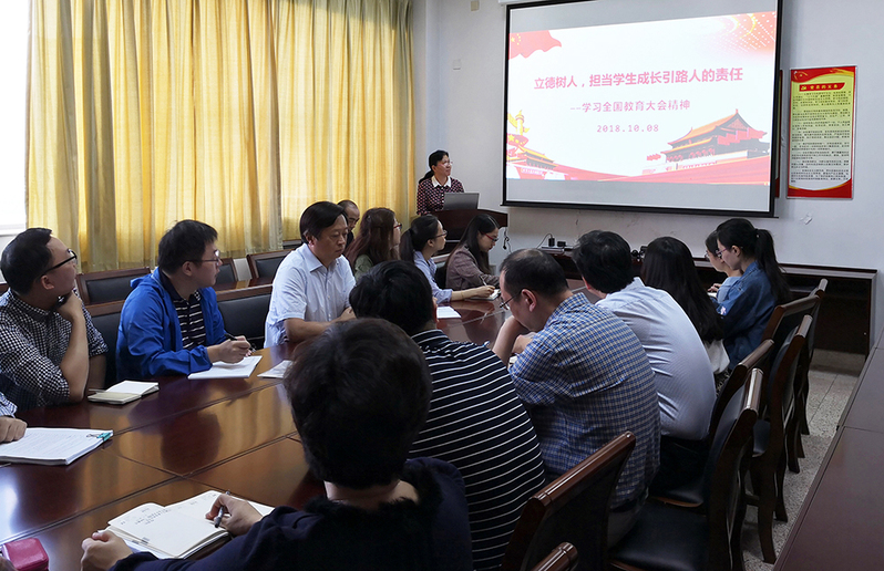 全国教育大会是新时代召开的第一次全国教育大会,在我国教育发展史上具有里程碑意义。习近平总书记在会上的重要讲话从“重大理论成果、基本战略、历史事实、总体要求、首要问题、重点任务、改革硬任务、根本保证”八个方面总结教育发展的成就,描绘了未来教育规划的蓝图,内容丰富、深刻全面,充分体现了党中央对教育工作的高度重视,为新时代教育事业指明了方向。周逸萍分享了三点学习体会,一是明确国家总要求,坚定树立中国特色社会主义理想信念;二是树立职业荣誉感,自觉肩负传承文明、塑造灵魂的新时代使命;三是担当引领学生责任,牢牢把握新时代五个“人”的工作目标。她要求全院上下认真学习领会大会精神和习近平总书记的重要讲话精神,切实增强责任感、使命感,结合工作实际,抓好落实;要紧紧围绕“立德树人”这一根本任务和“培养什么人、怎样培养人、为谁培养人”这一根本问题,进一步解放思想、履职尽责,做好学生成长的指导者和引路人,推动学院、学校教育事业再上新台阶,为加快高水平大学建设步伐贡献新力量。