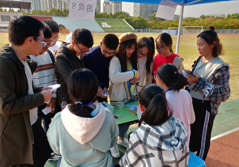 本次活动共准备了八个小游戏,摊点遍布操场。这些游戏里有考验个人学习成果的“听单词说中文”“缺词填空”项目,也有考验团队合作的“团队跳绳”项目,还有考验新生对学校了解程度的“趣味知识问答”项目。游戏采取个人战和团队战两种形式,活动中,同学们彼此合作,又相互竞争,在单词记忆摊点前冥思苦想、静如处子,在团队跳绳场地上欢笑不断、动如脱兔。