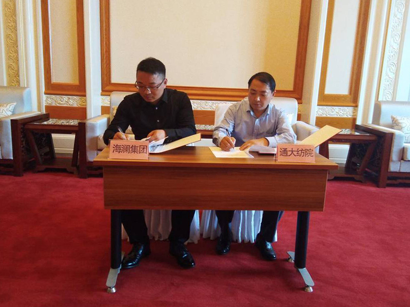 纺织服装学院副书记王如海与海澜集团副总经理吉敏生签署协议书。
