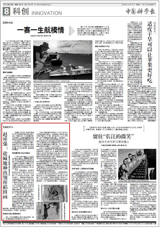 10月16日出版的《中国科学报》在科创版以《赵祥强:盐碱地种出别样稻田画》为题,报道了我校生命科学学院副教授赵祥强历时半年精心培育出以“红星照耀中国”和“功夫熊猫”为主题的两幅盐碱地稻田画。