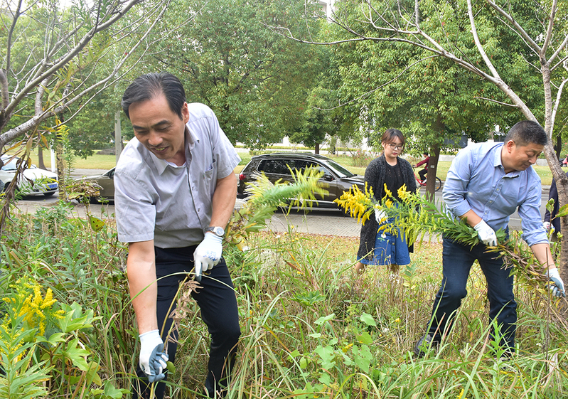 10月17日,后勤党委第三、第八、第九支部开展义务拔草活动,清理主校区南围墙附近的“加拿大一枝黄花”植物。
