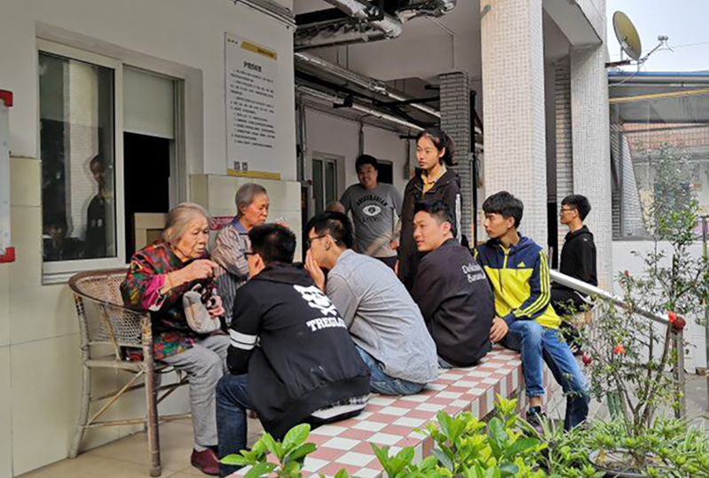 管理学院学生听老人讲故事。