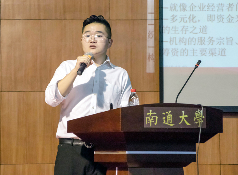王玮用“假如南通大学有一个水池,学生们自发去清洗水池是公益项目还是慈善项目?”等贴近生活的问题与学生们展开互动,向他们讲解了公益的含义:“公益解决社会问题,而慈善解决社会问题的受害者”。随后,王玮向学生们介绍了学生创业公益项目“创青春”,他说:“公益创业项目的重点在于“益”在哪里,以解决社会问题为目的,背后用一套什么体系去支撑,实现公益效果。”他还具体解释了考量“创青春”项目的三个维度——公益性、创业性和实践性。