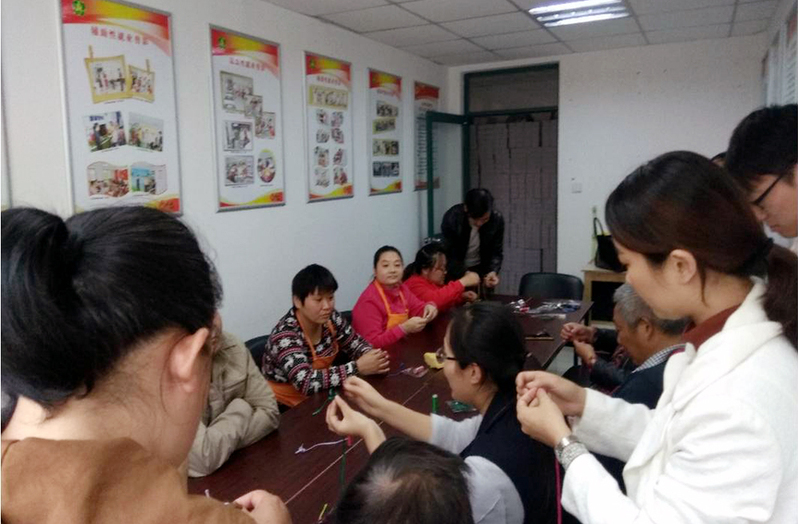 纺织服装学院吴圆圆、李晓燕老师以及“非遗舞蹈服饰研究中心”的师生们向文峰街道各社区康复协调员以及残疾人代表们详细介绍了盘扣的种类、操作的技巧及盘扣在服饰中的具体运用。纺织服装学院师生操作示范了中国传统盘扣的手工艺制作方法,并对现场的学习者逐一进行耐心的指导。