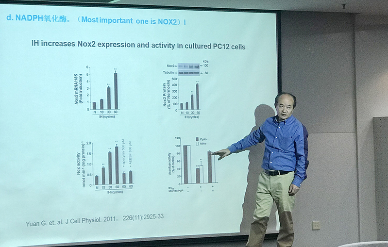 袁国祥以“气性递质在间歇性缺氧激活颈动脉体中的作用”为题,聚焦气性递质的问题和难点,以睡眠呼吸暂停为例,结合图表数据形象生动地从NADPH氧化酶、抗氧化酶活性降低、活性氧自由基等方面详细阐述了气性递质在间歇性缺氧激活颈动脉体中的作用。报告会后,袁国祥还与师生展开了深入的交流探讨,对师生提出的问题进行了耐心细致的解答。
