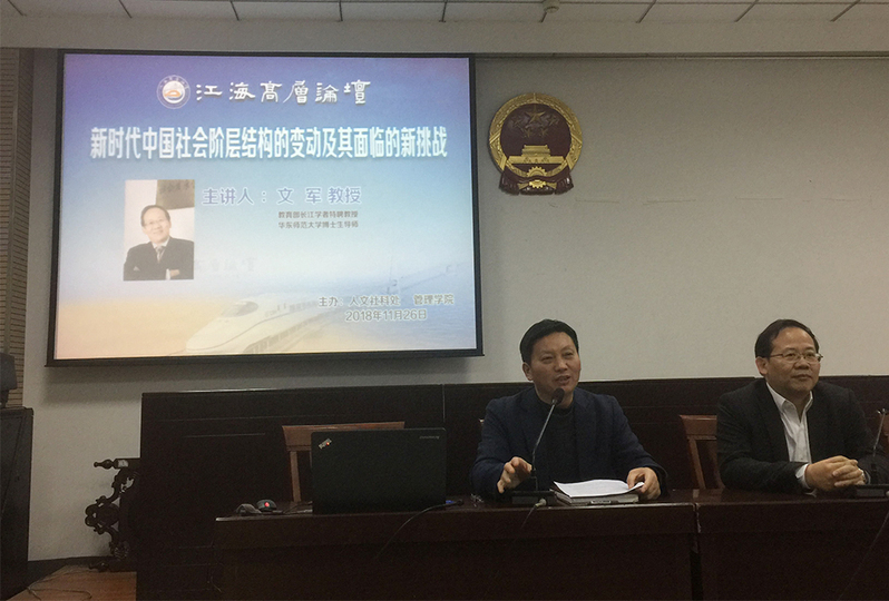 11月26日晚,华东师范大学社会发展学院院长文军教授作客第16期“江海高层论坛”,为管理学院师生作了题为《新时代中国社会阶层结构的变动及其面临的新挑战》的学术报告。