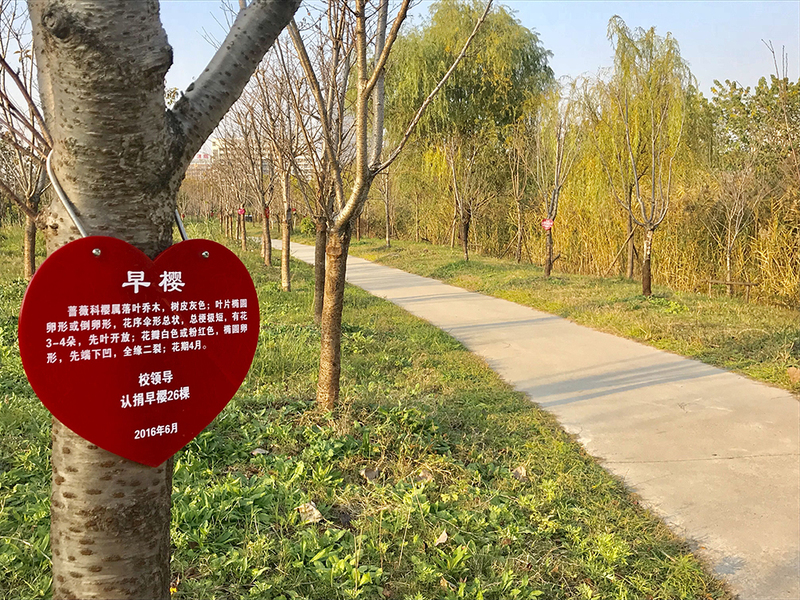 樱花园始建于2016年3月,工会、学工处、后勤保障部向全校师生员工发出“创建绿色校园 共建美丽通大”的倡议书,经党委组织部、校工会、团委、发展规划处等部门的积极发动,34个二级党组织积极响应,发展成为轰轰烈烈的“践行两学一做,共建美丽通大”主题党日活动,全校共捐赠600多棵树木,师生以认捐树木的方式,表达了爱校、兴校情感。经过后勤保障部环境服务中心两年多的科学管理、精心养护,园内早樱、广玉兰、香橼、榉树、垂丝海棠、桂花等长势良好,成为一道亮丽的风景线。