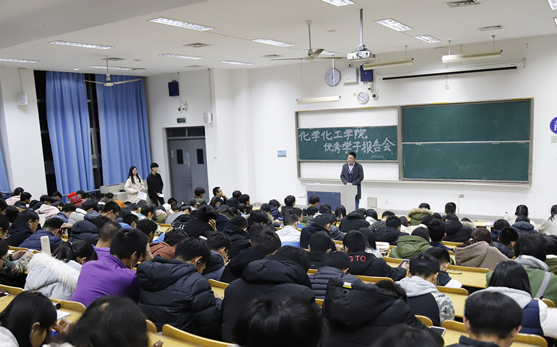 12月5日晚,化学化工学院举办优秀学子报告会。郝梦迪、李羽彤、钱宏伟、高学信、姚海丽五位优秀学生代表分享学习、创业过程的经历。化学化工学院2018年级全体学生参加活动。