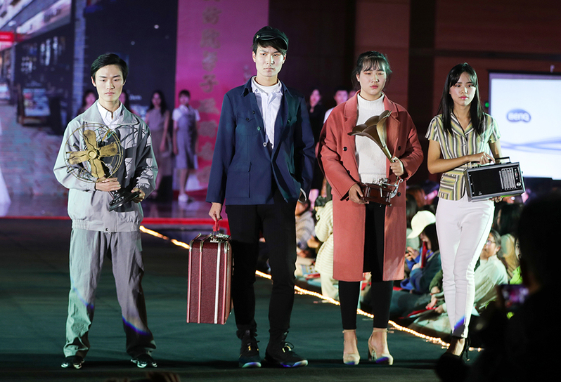 服装,是社会文化的产物,承载着人们深层次的精神需求。改革开放以来,社会生产力飞速发展,这四十年中人们衣着的变化,是物质文明和精神文明共同进步的写照。在《青苹果乐园》《童年》《外婆的澎湖湾》《光辉岁月》《明天会更好》等80、90年代的经典旋律中,以纺织服装学院2018级新生为主体的50余名同学向观众们展示了改革开放四十年来有代表性的生活物件、现代蓝印花布服饰、中华历代经典服饰、流行影视服饰以及现代礼服等。T台上,一件件喇叭裤、花色格子裙、高腰卫衣、格子背心裙、网纱短袖、健美裤、雪纺连衣裙、丝绒长袖旗袍、雪纺泡泡袖上衫、百褶裙、婚纱西服、老式二八加重自行车、留声机、收音机、老式电风扇、皮箱等让现场观众重温了改革开放四十年带来的巨大变化,共展出服饰、物件60余种。最终,晚会在音诗画《盛世中国》的激情朗诵中落下帷幕。