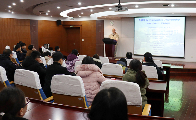 12月27日下午,美国得克萨斯大学西南医中心Cheng-Ming Chiang(江正明)教授受邀来校为医学院青年教师作题为《BRD4 in Transcription programming and cancer therapy》的学术报告。医学院党委书记周逸萍主持报告会。
