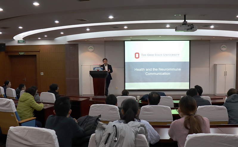 1月7日下午,美国俄亥俄州立大学行为医学院、口腔生物学系研究生科系主任全宁教授应邀来我校进行学术交流,为医学院师生作了题为《Health and neuroimmune communication》的学术报告。报告会由学院院长孙斐主持,医学院青年教师及研究生聆听了报告。