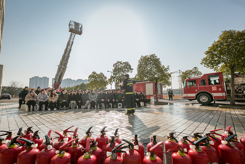 13:55分,我校消防应急小组和南通市消防支队接到工程训练中心消防安全演练电话,消防应急小组立即赶到现场处置,市城区消防支队4辆消防车也迅速赶到现场,展开救人、救火等项目演练。警铃一鸣,消防疏散演练正式拉开帷幕。演练模拟工程训练中心三楼一实验室内突发火情,冒出浓烟,发现险情后,保卫处立即启动应急预案,指挥人员引导各楼层人员紧急有序疏散撤离,并进行火灾扑救和云梯救人,同时拨打119报警求助。模拟演练结束,南通市消防支队新城中队队长田丰现场进行《冬季消防安全讲座》,随后组织了中心教职工在现场进行了消防实操,开展灭火演练。
