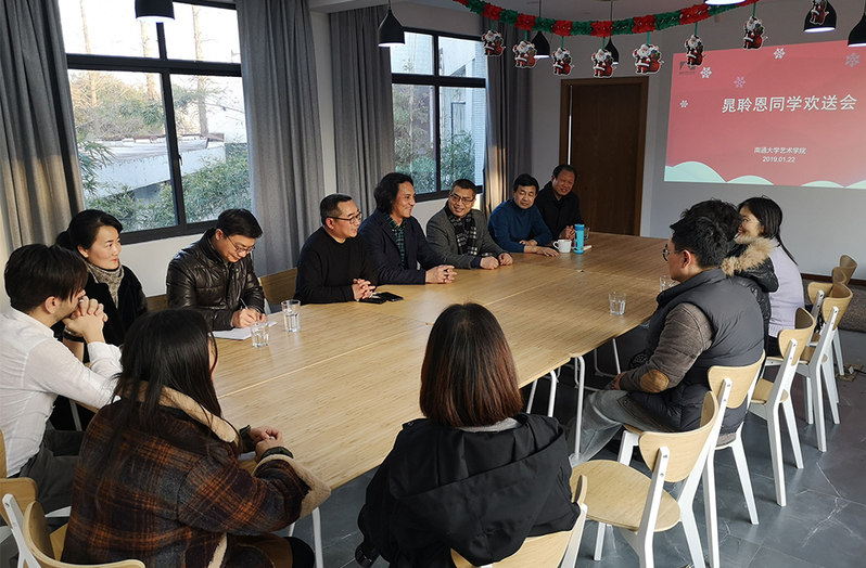 欢送会上,染织艺术研究中心主任郁新颜、教师代表汪训虎、学生代表王管婷分别介绍了晁聆恩同学本学期的学习生活情况,对其良好的表现予以积极的肯定。郁新颜代表染织艺术研究中心向晁聆恩同学发放本学期成绩单;艺术学院副院长张卫代表艺术学院向晁聆恩颁发学习证明;学院党委书记马列波代表艺术学院向晁聆恩同学赠送艺术学院的版画作品;学院专员汪松明、副院长兼副书记王德宽、副院长吴蓉分别代表艺术学院向晁聆恩同学赠送中国传统笔墨礼品。
