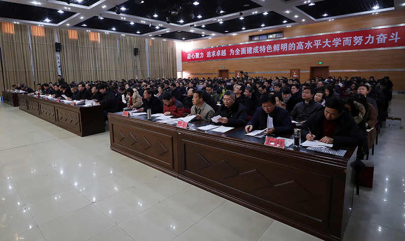 浦玉忠作了题为《紧盯目标勇担当 凝心聚力抓落实 推动特色鲜明的高水平大学建设迈上新台阶》的讲话。他指出,本次大会是在全面贯彻落实学校第三次党代会精神、启动实施“8050计划”、建设特色鲜明的高水平大学的开局之年,召开的首场全校性大会。就做好2019年学校工作,浦玉忠提出三点要求。一是认真学习贯彻上级会议精神,把握2019年工作总体要求。要认真学习贯彻第二十六次全省高校党的建设工作会议、全省教育工作会议这一系列重要会议精神,立足高等教育发展大背景,进一步解放思想、更新观念,坚持立德树人,推动全面从严治党向纵深发展,充分发挥全校教职工干事创业的积极性、主动性和创造性,全力推动学校事业向高质量发展迈进。二是抓好重点工作落实,确保“8050计划”实现良好开局。在方向站位上,要坚持立德树人,加强党对学校工作的全面领导;在目标任务上,要抓好党代会重点工作任务分解,推动举措落地生根;在路径方法上,要持续推进体制机制改革,全面激发发展活力;在精神状态上,要强化拼搏进取的责任担当,全面提振干事创业的精气神。三是全心全意依靠教职工办学,打造和谐进取、共生共荣的“命运共同体”。要进一步加强教代会和工会自身建设,积极推进民主管理和民主监督,努力增进教职工福祉。