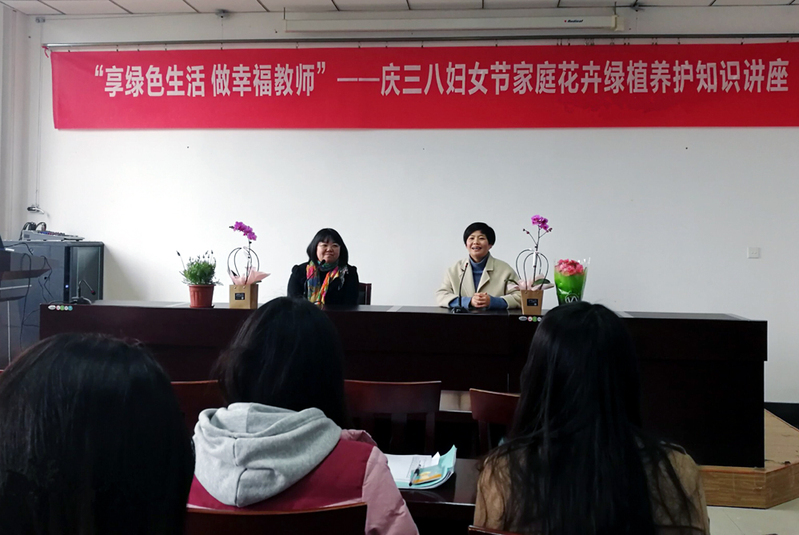 我校举办三八节家庭花卉绿植养护知识讲座。
