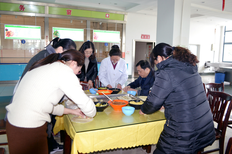 后勤党委书记魏伟对女教工致以节日的问候,感谢大家对后勤工作的支持,并和女教工一起合作包春卷。大家有的拌馅,有的剥春卷皮,有的包春卷,现场一副其乐融融的景象。