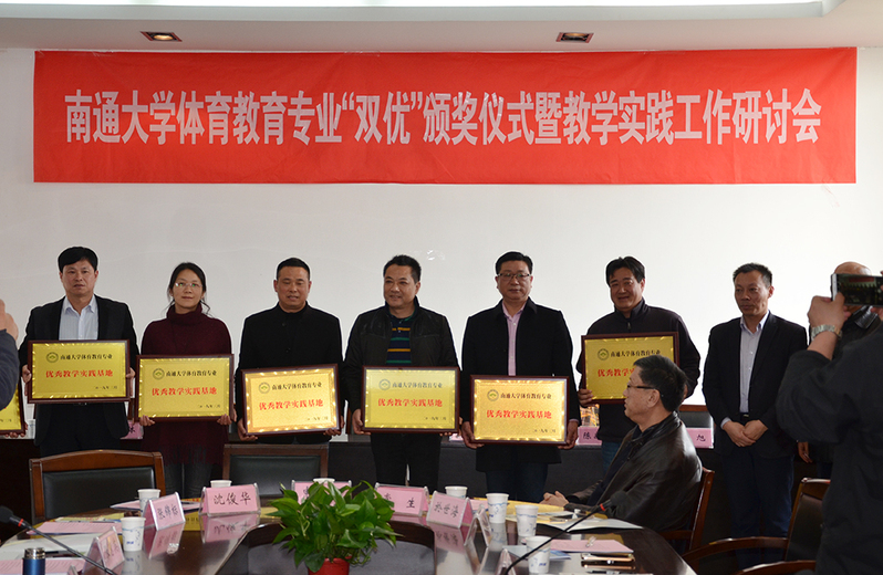 3月30日下午,体育科学学院举办体育教育专业“双优”颁奖仪式暨教学实践工作研讨会。通大附中、南通中学、启秀中学以及l来自苏南地区共17所中学的领导和老师参会。体育科学学院院长刘健代表学院与17所中学签订了“体育教育专业教学实践基地建设协议书”,并向优秀教学实践基地及优秀指导教师颁发了奖牌与证书。