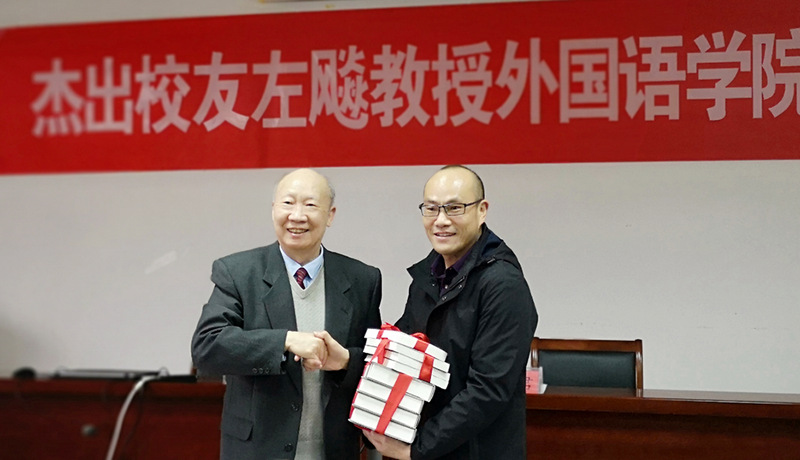 左飚教授对三套书籍进行了深刻解读,提出英语语言学习者要在求同存异的文化心态中促进中西文化交流和对话。他表示作为校友,对母校有着深厚的感情,树高千尺不忘根,希望此次赠书能够进一步充实学校资料库,激发学校师生从事科学研究的热情。