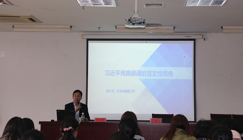 4月11日,中央文献翻译研究基地主任、天津外国语大学陈大亮教授应邀来校,为外国语学院师生作了题为《习近平用典翻译的互文性视角》的学术报告。
