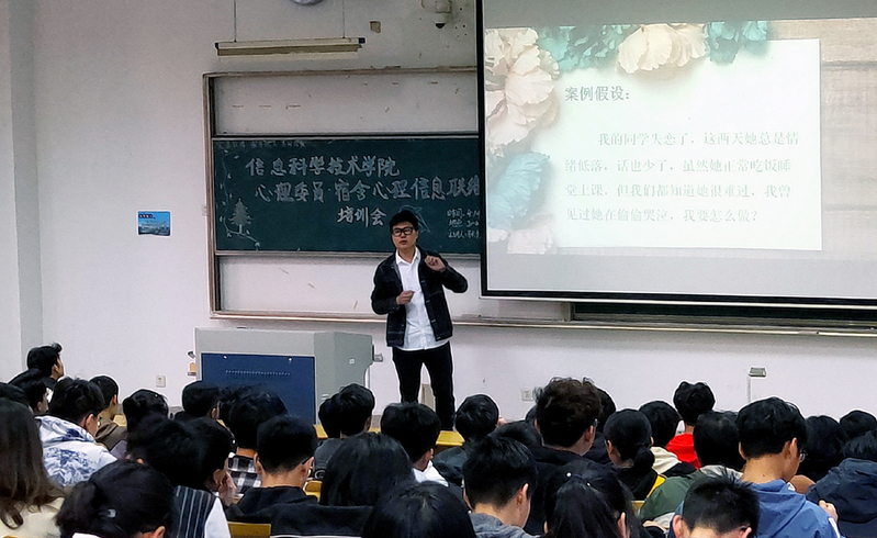4月16日,信息科学技术学院举办“助人自助,共同成长”心理委员、宿舍心理信息联络员培训会。学院辅导员张恒对600余名学生进行培训。