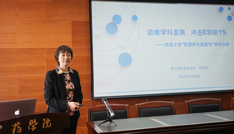 4月24日下午,药学院举行学科发展学术报告会。图书馆研究馆员张志美应邀为药学院师生作题为《助推学科发展,冲击ESI前1%》的学术报告。
