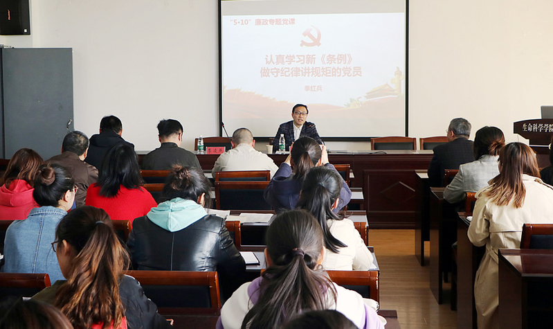5月8日下午,校纪委副书记、纪委办公室主任季红兵受邀为生命科学学院、公共卫生学院师生党员上题为《认真学习新<条例>,做守纪律讲规矩的党员》廉政专题党课。生命科学学院党委书记季凌燕主持活动。