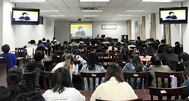 钱玥旨的讲座讲述了中国传统音乐的渊源、形貌特征、名家风范和美学意蕴。她以传统音乐发展的时间为线索,从民歌、器乐、戏曲三个方面介绍了传统音乐的发展脉络,通过江苏民歌《姑苏风光》与《天涯歌女》、陕北民歌《知道不知道》与电影《天下无贼》片尾曲、河北民歌《小白菜》与《北风吹》及《山不转水转》等经典音乐作品的比较分析,向在场师生展示了民歌与现代流行音乐的历史渊源;结合时下流行的电视节目《经典“咏”流传》中的古典诗词吟唱,讲述传统音乐的当代传承;从影视作品中的古琴乱象及范例带领大家认识了古琴的文化象征;从戏曲与流行音乐的融合,畅谈传统戏曲的继承与发展。