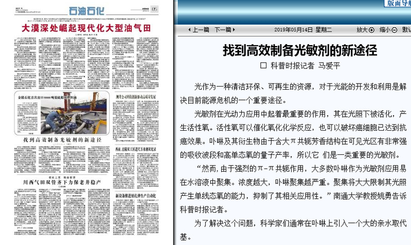 5月14日出版的《科普时报》在第五版《以《找到高效制备光敏剂的新途径》为题,报道了我校化学化工学院姚勇教授课题组关于高效制备光敏剂的研究成果。中国科技网进行了转载报道。