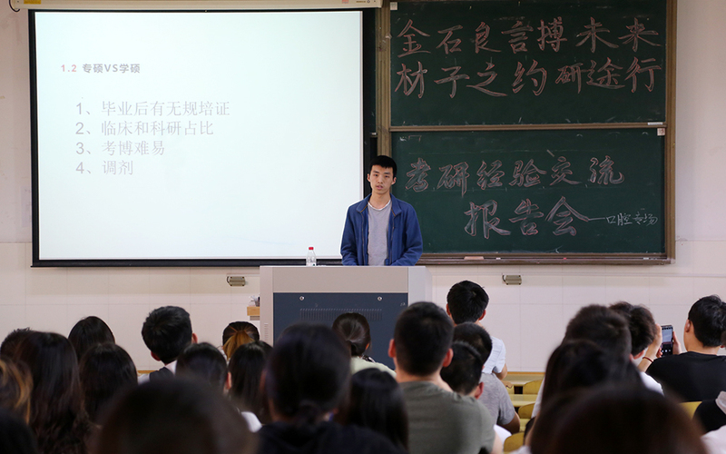 近日,医学院举办2019年考研经验交流报告会,分别面向临床医学、口腔医学、医学影像学、康复医学、生物信息五个医学专业开设专场,邀请考取上海复旦大学、南京医科大学等知名高校的研究生同学进行经验分享。