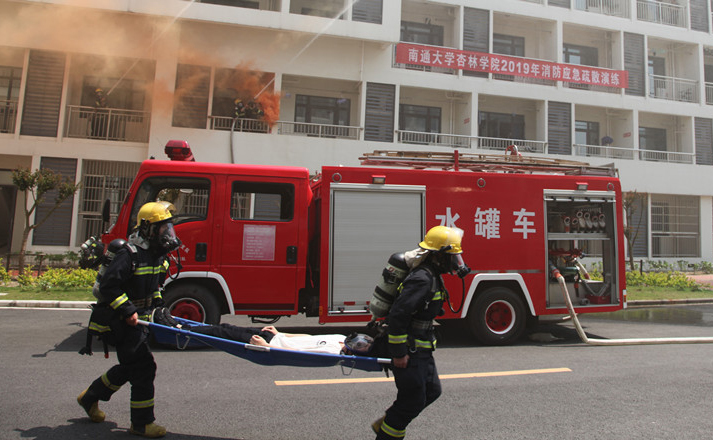 杏林学院副院长曹阳宣布演练正式开始,工作人员随即点燃烟幕弹,模拟“火情”发生。最先发现“火情”的人立即拨打“119”报警,并组织人员紧急撤离,学生接到疏散指令后迅速有序地从宿舍楼撤离到安全开阔地点。接到警情的启东市高新区消防中队的消防车即刻赶至现场进行灭火,并携带空气呼吸器深入“火场”营救被困学生。演练结束后,曹阳对演练进行了点评。