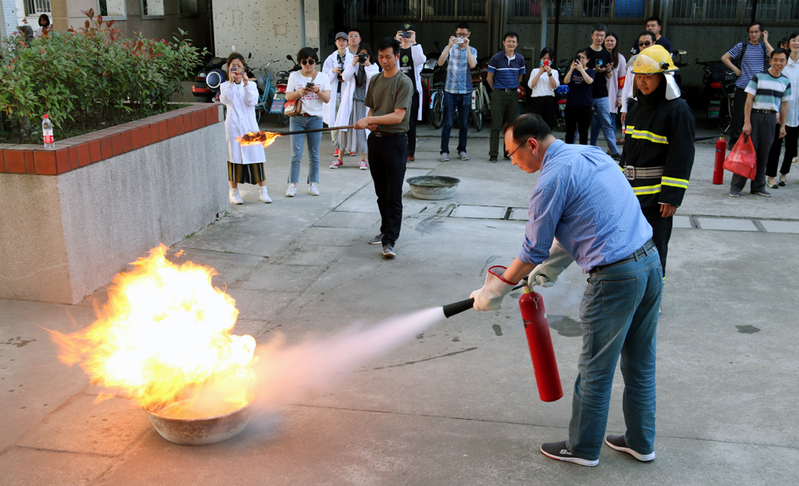 下午4点,随着橙色烟雾的蔓延,警报声响起,史亚琴宣布演练正式开始。指挥员发现火情后,立即向楼内人员下达疏散指令,提醒不要惊慌,保持镇静。实验室学生在消防引导员的引导下纷纷用湿毛巾捂住口鼻、俯身迅速从楼梯、疏散通道向外转移。近两百名学生在短时间内全部安全疏散。随后,院红十字会同学现场演示了如何对受伤人员进行急救,保卫处老师从火灾预防、实验室火场自救、消防灭火设施的正确使用等方面对在场师生进行了详细讲解,全体师生现场操作使用灭火器,掌握了使用灭火器的方法。整个演练过程组织有序、分工到位、有条不紊,达到了预期效果。