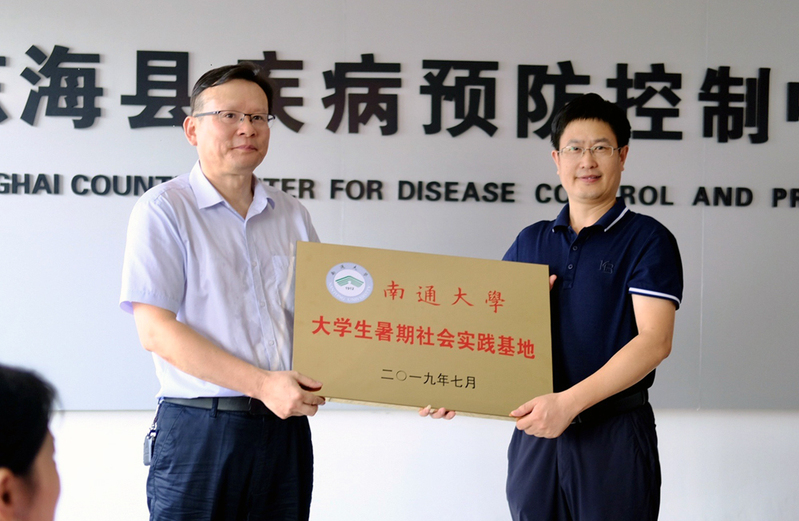公共卫生学院党委书记曹勇与东海县疾控中心副主任、副书记周忠为“南通大学大学生社会实践基地”揭牌。