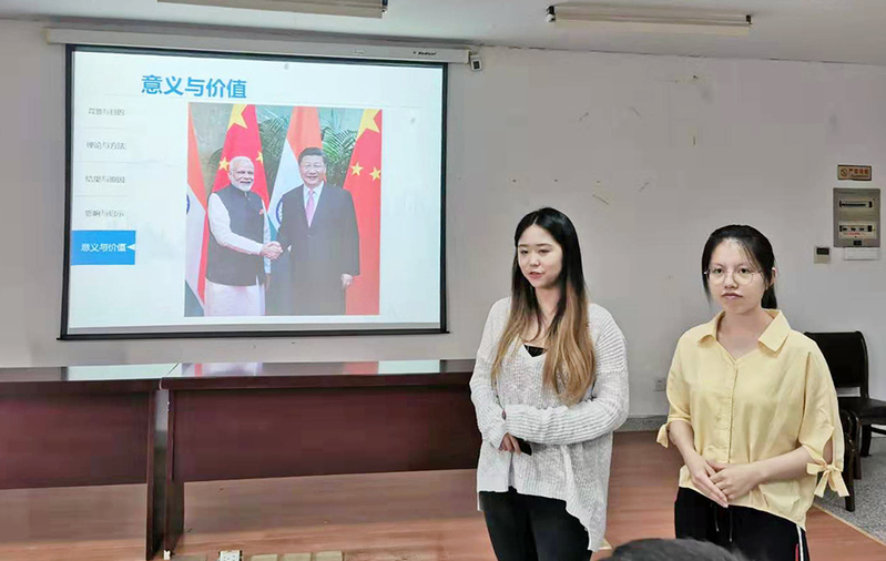 8月22日下午,外国语学院举行2019年“挑战杯”国赛项目模拟答辩会。由王雪玉、刘道影、王媛媛老师指导、张明慧等同学主持的项目《印度主流媒体对“一带一路”倡议的认知情感变化及原因分析》进行展示和答辩。