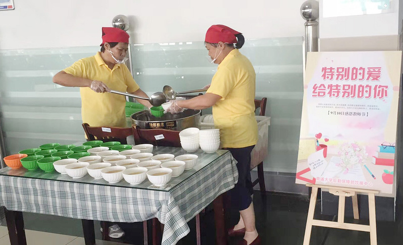 各校区教工食堂人头攒动,前来就餐的教职工每人获得一份赠送的银耳羹或酸奶,同时一句简单的“教师节快乐”的祝福让每位就餐老师脸上挂满了笑容。