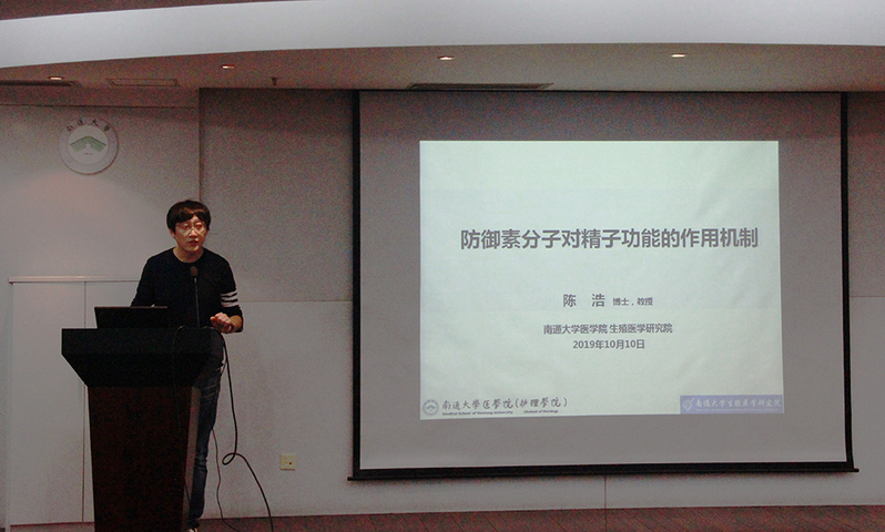 10月10日下午,医学院举办青年教师“星光”学术沙龙新学期首场讲座。邀请我校生殖研究院副院长陈浩教授为青年教师作题为《防御素分子对精子功能的作用机制》的学术报告,讲座由学院副院长陈罡主持。