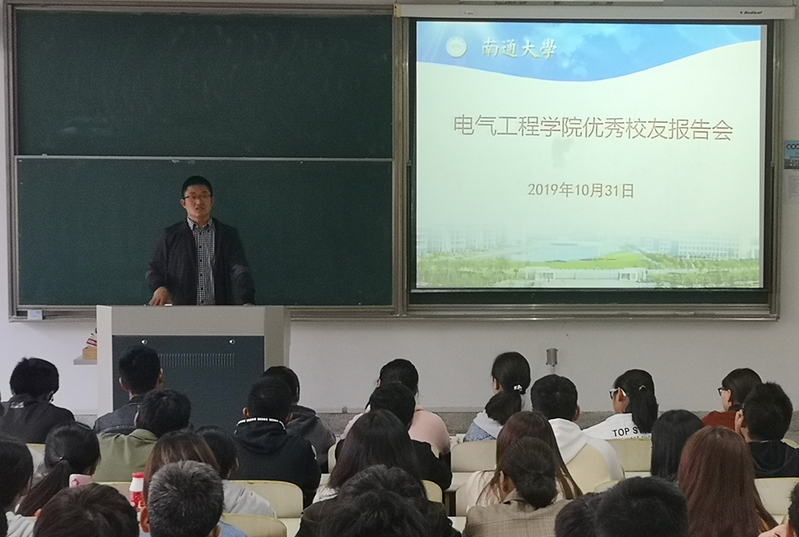 10月31日上午,南通大学校友、创业导师、苏州保控电子科技有限公司总经理朱健应邀来校,为电气工程学院建筑电气2016级、2019级学生做专题报告。