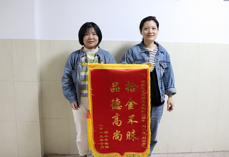 近日,南通市民邓小芹女士将一面“拾金不昧 道德高尚”的锦旗送到医学院,感谢人体解剖与组织胚胎学研究生刘明珠、刘云芳拾金不昧的行为。